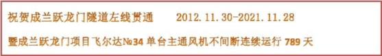 2019 年10 月1 日,飛爾達(dá)主通風(fēng)機(jī)抵達(dá)躍龍門隧道風(fēng)井后,在項(xiàng)目部指揮長王海亮的指揮下,在項(xiàng)目部孫、王副指揮長等領(lǐng)導(dǎo)的大力協(xié)助下,2019 年 10 月 6 日主通風(fēng)機(jī)安裝完成,開機(jī)運(yùn)行,主通風(fēng)機(jī)各項(xiàng)參數(shù)均達(dá)到設(shè)計(jì)要求。至今日,單臺主通風(fēng)機(jī)不間斷連續(xù)運(yùn)行789 天,保障躍龍門隧道左線順利貫通,我們相信右線貫通已在眼前,飛爾達(dá)風(fēng)機(jī)也將伴隨躍龍門隧道項(xiàng)目部一同完成最后的使命。